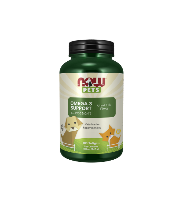 NOW Pets Omega-3 Support Softgels provide dogs and cats with a clean, high-quality source of essential omega-3 fatty acids to support overall wellness. These softgels feature a great natural fish flavor that pets love, making daily supplementation both easy and enjoyable. Formulated and recommended by Dr. Barbara Royal, DVM, CVA, founder of The Royal Treatment Veterinarian Center, this supplement delivers veterinarian-approved nutrition you can trust.