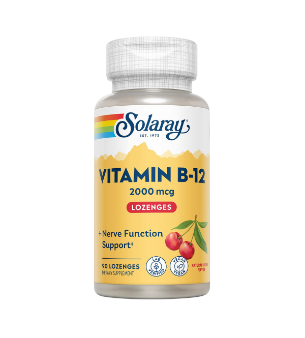 Vitamin B-12 may help support healthy metabolism, normal red blood cell production, and nerve function. Vitamin B-12 is a water-soluble vitamin that must be obtained through your diet. Providing 2,000 mcg or 83,333% DV of this essential nutrient, Solaray Vitamin B-12 is a high-potency supplement designed to help support healthy hair and skin, brighten your mood, and light up your energy.